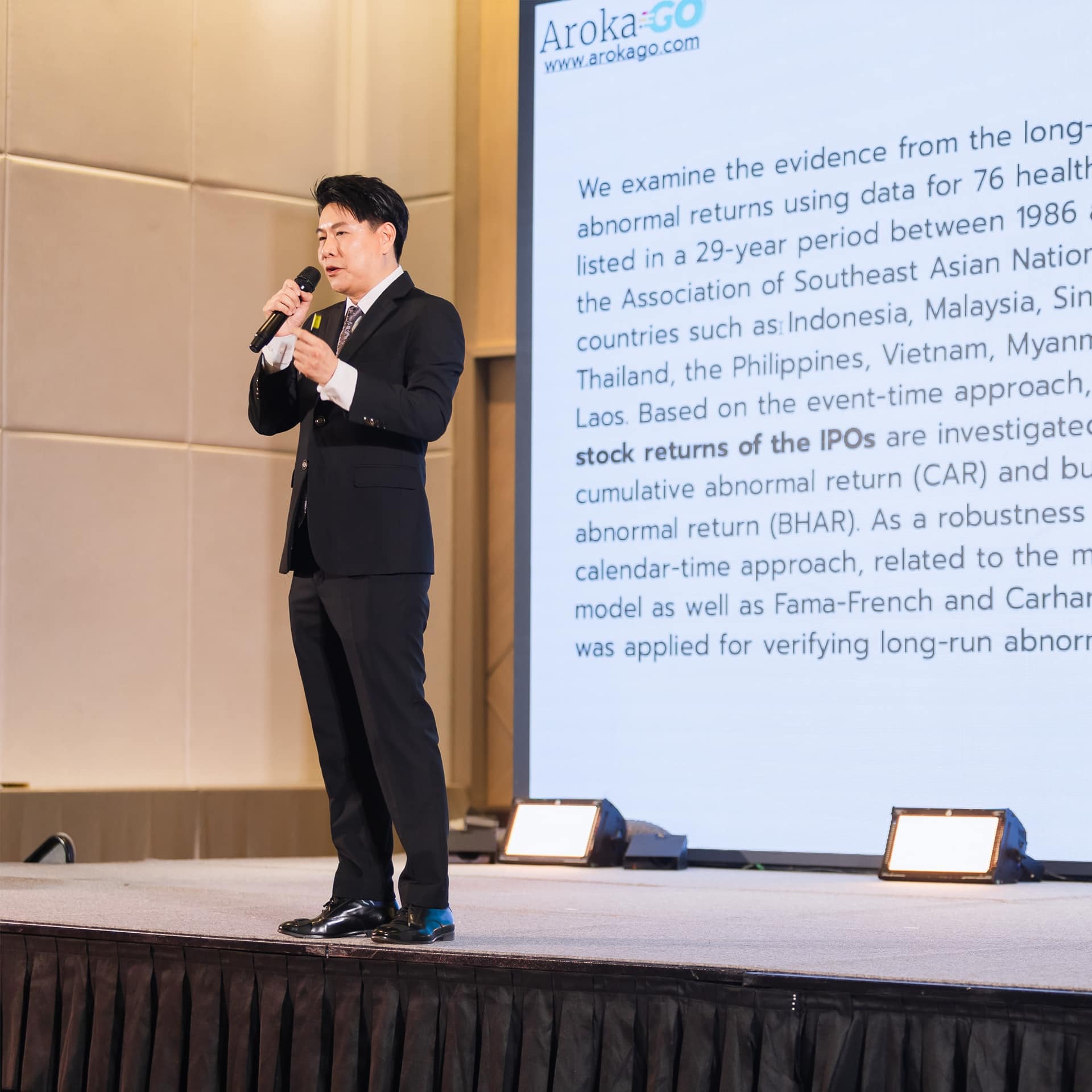 The seminar began with a presentation by Assistant Professor Dr.Kulabutr Komenkul, CEO and Co-Founder of ArokaGO. Executive Director of TMWTA, and lecturer in Finance, Investment, and Financial Technology at Dhurakij Pundit University. He presented research titled "Aftermarket Performance of Health Care IPOs: Evidence From ASEAN Countries," which studied the long-term returns of healthcare IPOs in ASEAN countries. The study used data from hospital IPOs listed in ASEAN countries, analyzing 3-year IPO returns using Cumulative Abnormal Return (CAR) and Buy-and-Hold Abnormal Return (BHAR) to measure long-term abnormal returns. The robustness of the results was tested using the Calendar-Time Approach and financial models such as the Fama-French and Carhart Models. The findings revealed that the returns of healthcare IPOs in ASEAN differ from studies in the U.S. The Fads Hypothesis partially explains the long-term underperformance of IPOs in ASEAN. Thai and Malaysian IPOs have better long-term returns due to longer silent periods for strategic shareholders (averaging 1–1.5 years) compared to the U.S. and Singapore (averaging 3–6 months). Small and medium-sized companies in the healthcare industry have better long-term returns than large companies in the ASEAN market. This research provides insights for entrepreneurs aiming to enter the capital market, especially in the ASEAN healthcare industry. This knowledge helps entrepreneurs plan and strategize appropriately for IPOs.