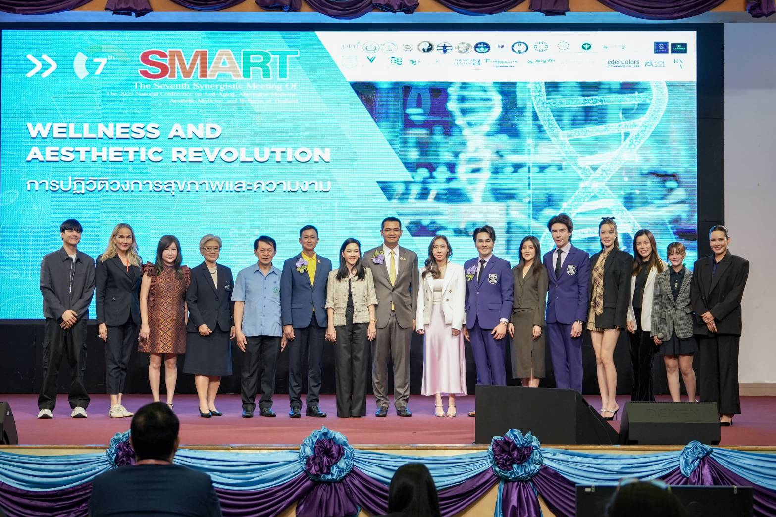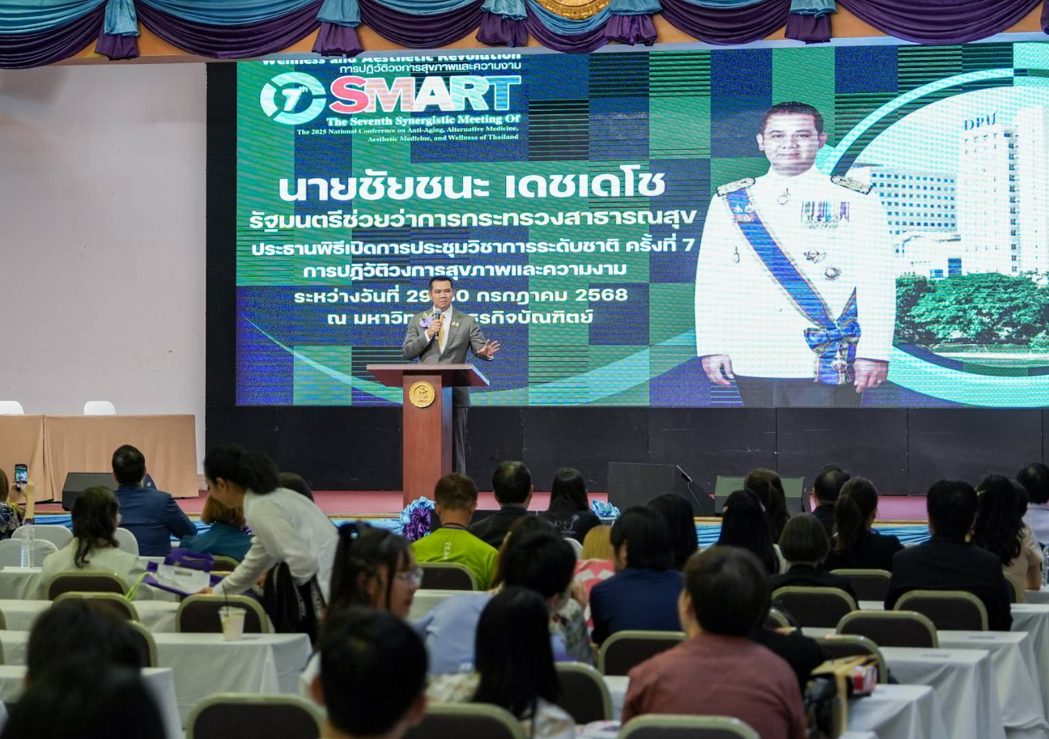 On July 29, 2025, the College of Integrative Medicine (CIMw) at Dhurakij Pundit University (DPU) hosted the opening ceremony of the 7th SMART National Academic Conference under the theme "Wellness and Aesthetic Revolution." Held from July 29–30, 2025, the conference aimed to advance knowledge in anti-aging medicine, alternative medicine, Thai traditional medicine, and aesthetic medicine—fields that play a crucial role in promoting proactive healthcare, reducing disease burden and healthcare costs, and improving long-term quality of life.