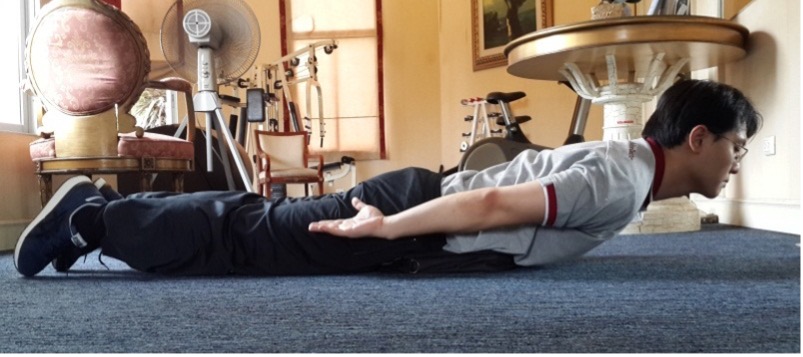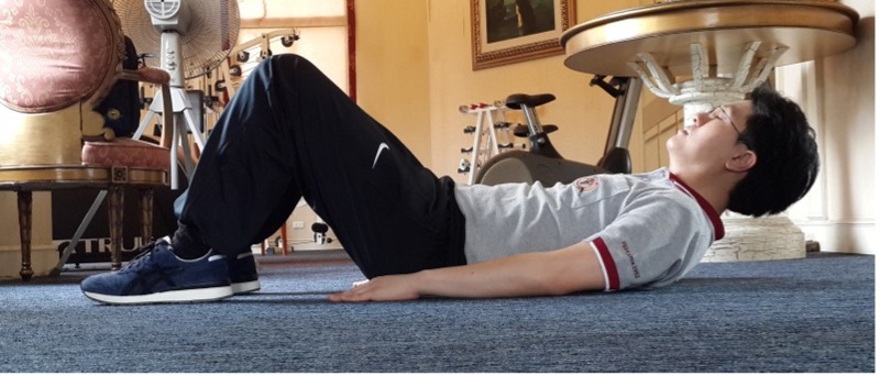 3.1. Músculos da parte superior das costas: Deite-se de costas com um travesseiro sob a cintura, braços ao lado do corpo. Levante ligeiramente a cabeça e o peito enquanto aperta as omoplatas.