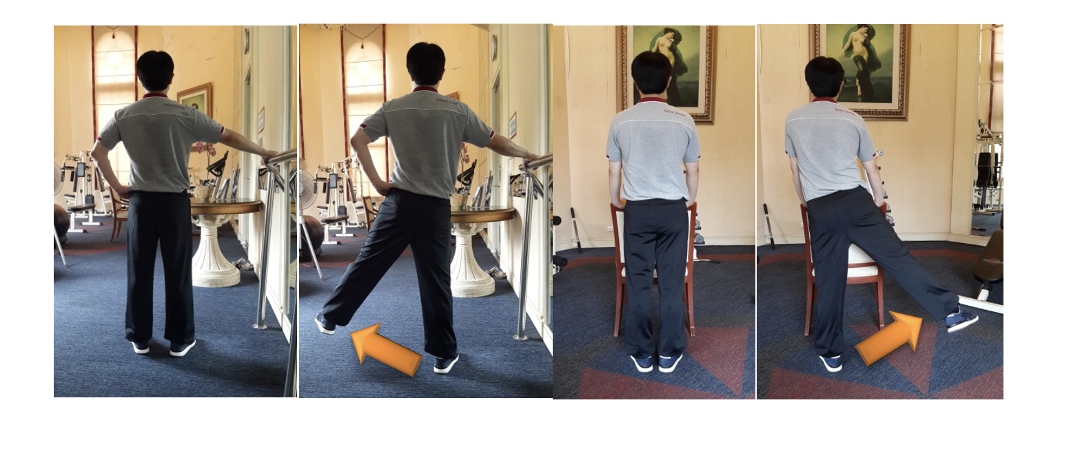 4.2. Músculos abdutores do quadril: Fique em pé enquanto segura em um corrimão ou cadeira, mova uma perna para fora para o lado 10 vezes de cada lado.