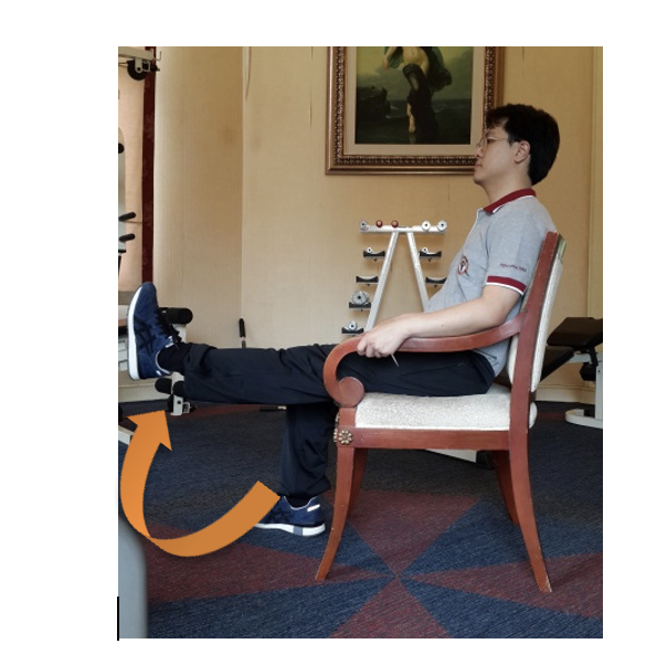 4.3. Músculos extensores do joelho: Sente-se em uma cadeira com apoio nas costas, estenda um joelho e mantenha por 10 segundos, depois abaixe lentamente. Alterne 10 repetições por perna.