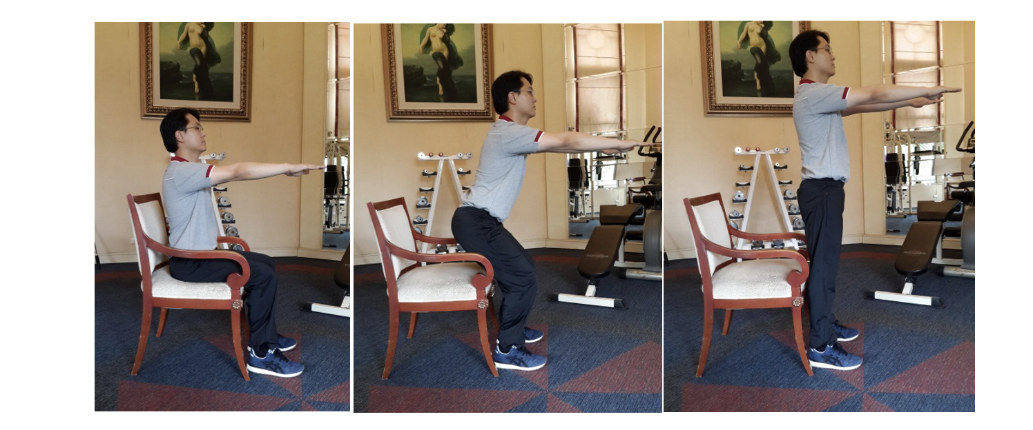 5.2. Exercício de sentar e levantar: Sente-se em uma cadeira com as costas retas, braços estendidos à frente e pés planos no chão a cerca de 1 pé de distância. Incline-se lentamente para frente e levante-se, depois abaixe-se gradualmente até sentado. Repita 10–20 vezes.